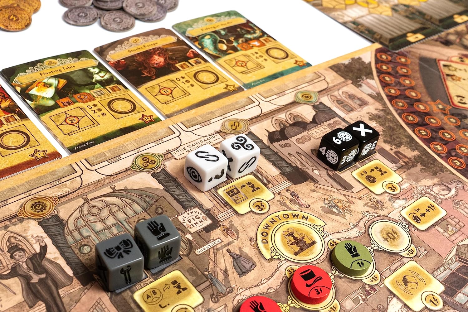 Trickerion ist ein wettbewerbsfähiges Strategiespiel im Euro-Stil, das in einer fiktiven Welt spielt, die vom städtischen Leben und der Kultur des späten 19. Jahrhunderts inspiriert ist und mit einer Prise Übernatürlichem gewürzt ist. Die Spieler übernehmen die Rollen von rivalisierenden Bühnen-Illusionisten, jeder mit seinen eigenen Stärken und Eigenschaften. Sie streben nach Reichtum und Ruhm in einem Wettbewerb, der von einem legendären Magier ausgerichtet wird, und suchen nach einem Nachfolger, der dem mächtigen Trickerion-Stein würdig ist, der seinem Besitzer angeblich übernatürliche Kräfte verleiht. Mithilfe von Workerplacement und gleichzeitiger Aktionswahlmechanismen erhalten die Illusionisten und ihre Helferteams - der Ingenieur, der Assistent, der Manager und eine Handvoll Lehrlinge - Blaupausen und Komponenten für immer komplexere Zaubertricks, erweitern das Team und richten Aufführungen durch den Besuch der Downtown-, Dark Alley-, Market Row- und Theaterstandorte auf dem Hauptspielbrett ein, das eine Stadtlandschaft des späten 19. Jahrhunderts darstellt. Die Tricks werden auf dem eigenen Workshop-Spielbrett des Magiers gespeichert und vorbereitet, während die Aufführungen selbst im Theater in Form eines Mini-Spiels mit viel Spielerinteraktion stattfinden. Die Auftritte bringen ihren Besitzern Ruhmpunkte und Münzen ein, basierend auf den Tricks, aus denen sie bestehen. Fame-Punkte haben mehrfache Verwendungszwecke, aber sie dienen auch als Gewinnbedingung - Nach Turn 7, wenn die letzte Performance-Karte offenbart wird, endet das Spiel und der Illusionist mit den meisten Fame-Punkten gewinnt. Das Spiel bietet 48 verschiedene Tricks aus den Kategorien Optical, Spiritual, Mechanical und Escape, über 90 Charakterfähigkeiten und 40 Special Assignment-Karten, die die Aktionen an den verschiedenen Spielstandorten beeinflussen. Das Basisspiel kann mit zwei optionalen Regelmodulen erweitert werden, um dem Spiel weitere strategische Tiefe zu verleihen. Die Erweiterung "Dark Alley" im Basisspiel fügt dem Spiel einen neuen Ort hinzu. Es enthält auch 48 neue Special Assignment-Karten, eine neue Stufe von Tricks und 27 Prophecy-Token, die bestimmte Spielregeln abwechselnd ändern können, was dem Spiel zusätzliche Abwechslung verleiht.