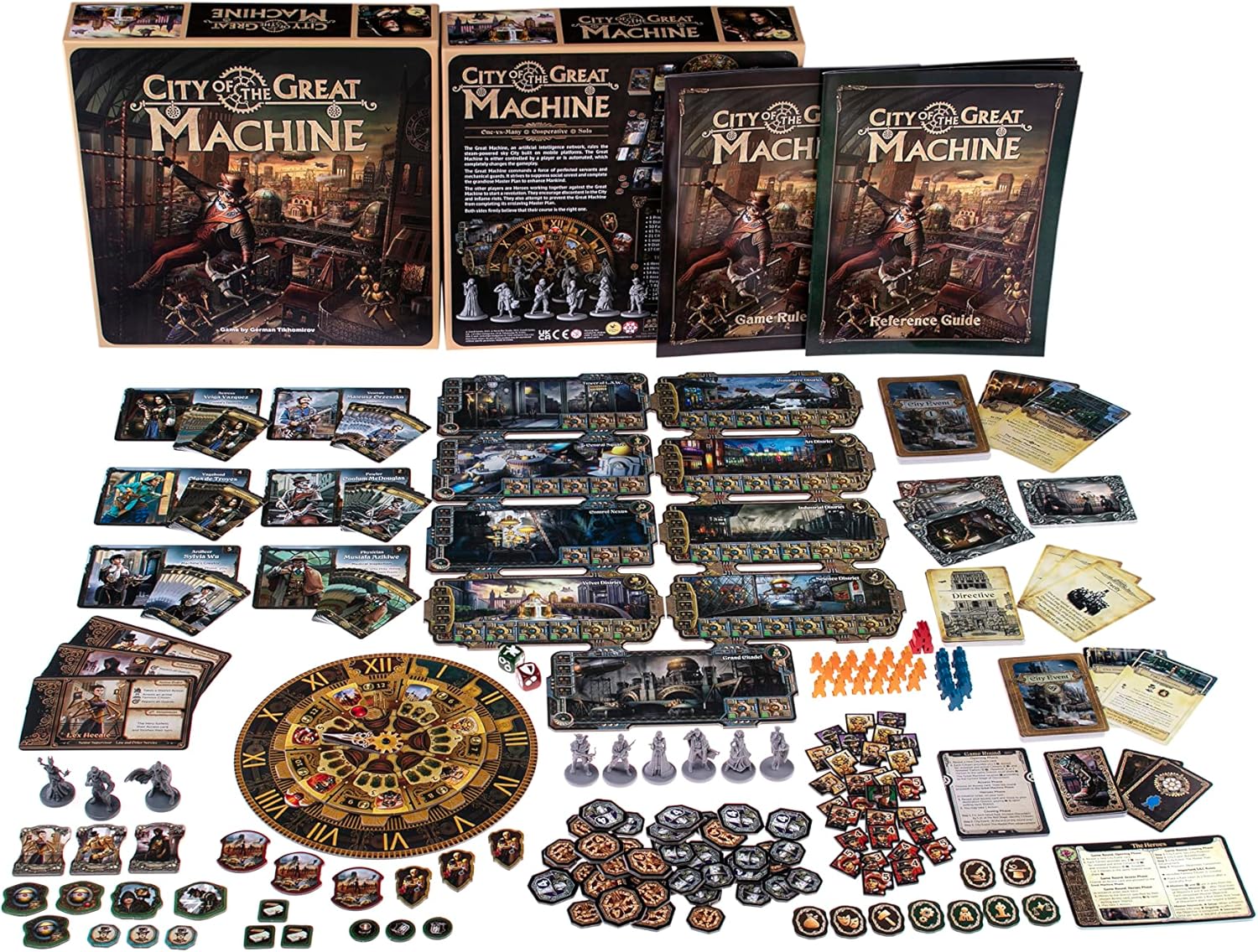 City of the Great Machine ist ein Strategiespiel, das in einem düsteren Universum des technokratischen viktorianischen Steampunk spielt. Das Spiel zeigt den Konflikt zwischen der Großen Maschine, einem Netzwerk künstlicher Intelligenz und einer Allianz von Helden. Die Great Machine wird entweder von einem Spieler gesteuert oder automatisiert, was das Spiel komplett verändert. Die Große Maschine kontrolliert eine Stadt, die auf mobilen Plattformen am Himmel gebaut wurde. Als die Große Maschine befehligt der Spieler (oder die Spiel-KI) eine Streitmacht von perfektionierten Dienern und mechanischen Wachen. Das ultimative Ziel der Großen Maschine ist es, soziale Unruhen zu unterdrücken und ihren grandiosen Masterplan zur Vervollkommnung der menschlichen Rasse zu verwirklichen. Die anderen Spieler sind Helden, die gemeinsam gegen die Große Maschine arbeiten, um eine Revolution zu starten. Sie fördern Unzufriedenheit in der Stadt, gewinnen die Unterstützung berühmter Bürger und schüren Unruhen. Sie versuchen auch, die Große Maschine daran zu hindern, den Masterplan zu vervollständigen, da er zur Versklavung der Menschheit führt. Spieleigenschaften: City of the Great Machine kann als One-vs-Many (2-4 Spieler) oder kooperativ/solo (1-3 Spieler) gespielt werden. Modulares Board ermöglicht unendliche Stadtpläne. Die Spieler können die Stadtbezirke während des Spiels neu positionieren. Versteckte Bewegung. In jeder Runde wählen die Helden heimlich die Bezirke, in die sie gehen werden. Ressourcenmanagement. Beide Seiten des Konflikts haben mehrere Aktionen zu ergreifen und für sie in Trust (Helden) oder Bonds (die Große Maschine) zu bezahlen. Das gleiche gilt für Bewegung und andere Aufgaben. Asymmetrisches Spielen und einzigartige Siegesbedingungen. Die Helden brauchen 3 Aufstände, um zu gewinnen, während die Große Maschine versucht, den Masterplan zu vervollständigen. Geheimhaltung. Die Helden müssen ihre Pläne vor der Großen Maschine verbergen, jedoch dürfen sie ihre Absichten nur in Gegenwart der Großen Maschine besprechen.