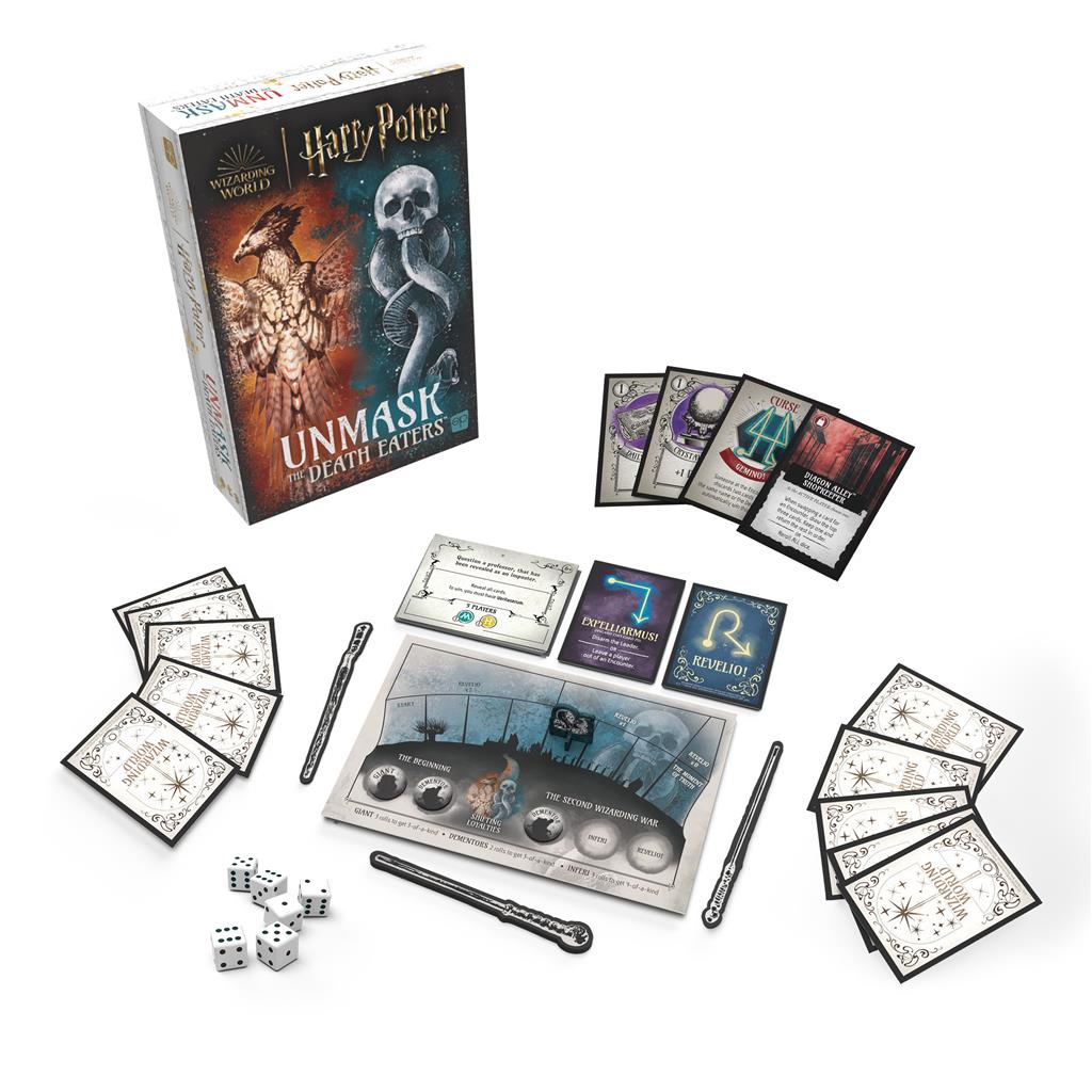 The Wizarding World is divided—are you loyal to the Order of the Phoenix, or are you aligned with the Death Eaters? In Harry Potter®: Unmask the Death Eaters, deception is around every corner as the magical community is at the mercy of He-Who-Must-Not-Be-Named and his followers. But going to battle will take vigilance, especially with curses being cast in secret by those among you. Taking on the roles of the magical community, work together to find out where loyalties lie and defeat Lord Voldemort™ to win!