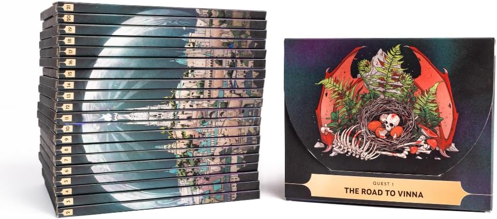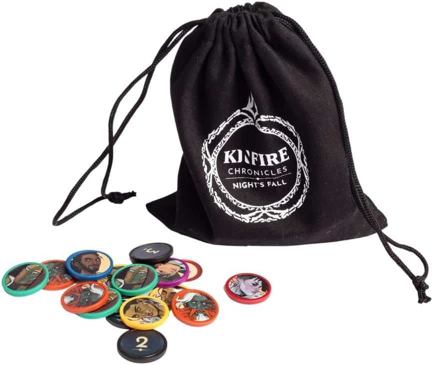 Kinfire Chronicles: Night's Fall ist ein kooperatives Kampagnen-Spiel, das spannendes Fantasy-Abenteuer mit taktischem Kampf am Rande des Sitzes verbindet. Spielen Sie als einer von sechs einzigartigen Suchern, die geschworen haben, die Stadt Din ⁇ Lux zu beschützen und zu helfen, die Welt dahinter wieder aufzubauen. Bewaffnet mit Gefährten-Lantern, werdet ihr euch den Sternenlosen Nächten stellen, gegen die Kreaturen kämpfen, die auftauchen, und euch gegenseitig vor den bösartigen Kräften schützen, die euch aufhalten wollen. Jede Quest hat drei Phasen: Abenteuer, Kampf und Erkundung. In der Abenteuerphase treffen die Spieler Entscheidungen basierend auf den auf den Quest-Karten präsentierten Optionen und müssen etwas erreichen (z. B. einen Fluss überqueren oder einen Verdächtigen verfolgen), indem sie die richtige Anzahl und Farbe der Karten aus ihren Decks umdrehen. In der Schlachtphase arbeiten die Spieler zusammen, um Feinde auf einer physischen Schlachtkarte zu besiegen. Die Runden werden durch Ziehen von Chips aus dem Schicksalsbeutel bestimmt, wobei jeder Feind nummerierte Token hat, die mit verschiedenen Angriffen und Aktionen übereinstimmen. Die Spieler können Aktionskarten in ihren eigenen Runden spielen, um Schaden zu verursachen, und können Boost-Karten in den Runden anderer Spieler spielen, um Dinge wie Schaden zu reduzieren, Spieler zu bewegen oder sogar einen gezogenen Chip in den Schicksalsbeutel zurückzugeben, um ihn neu zu ziehen. Das Spiel endet nicht, wenn ein Ziel nicht erreicht wird oder ein Feind die Helden besiegt, aber es wird das spätere Gameplay und die Wahlmöglichkeiten beeinflussen. Schließlich können Spieler in bestimmten Quests in der Explorationsphase in die Stadt zurückkehren, um mit NPCs zu sprechen, Gegenstände zu kaufen und ihre Decks zu verbessern. In jeder dieser Phasen sind Karten eingewoben, die dich dazu verpflichten, eine Entscheidung zu treffen, wie zum Beispiel auszuruhen, bevor du weitergehst, oder in die Schlacht zu ziehen, oder ob du jemandes Leben verschonen sollst oder nicht. Die Charaktere im Spiel haben ihre eigenen Moralvorstellungen und Standards, und wenn Sie nach Ihren Charakteren spielen, können Sie Kinfire-Token verdienen, die Ihnen helfen, aufzusteigen. Letztendlich sind die Entscheidungen, die du triffst, jedoch allein deine.