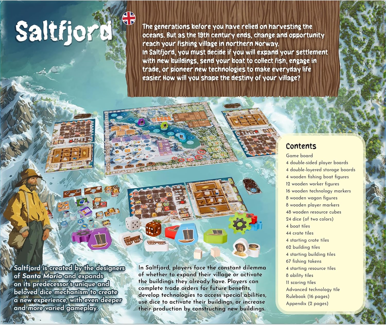 Saltfjord is set in a Norwegian fishing village, and is loosely based on the dice drafting mechanisms from "Santa Maria", but the game has otherwise been completely redesigned and expanded with new elements.