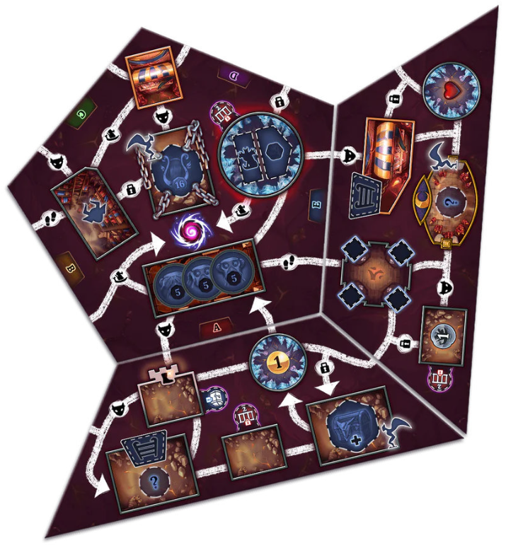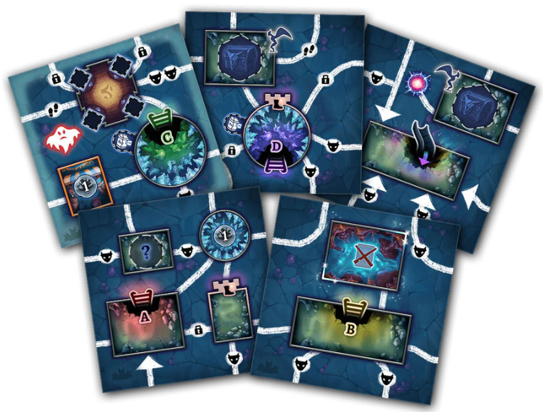 Underworld Startfliesen; 7 Unterweltfliesen; 6 Tiefenfliesen; 50 Dungeon Deck Karten; 4 Referenzkarten; 65 Punch-Token; Unterwelt-Wächter-Marker und -Karte; Spielregeln.