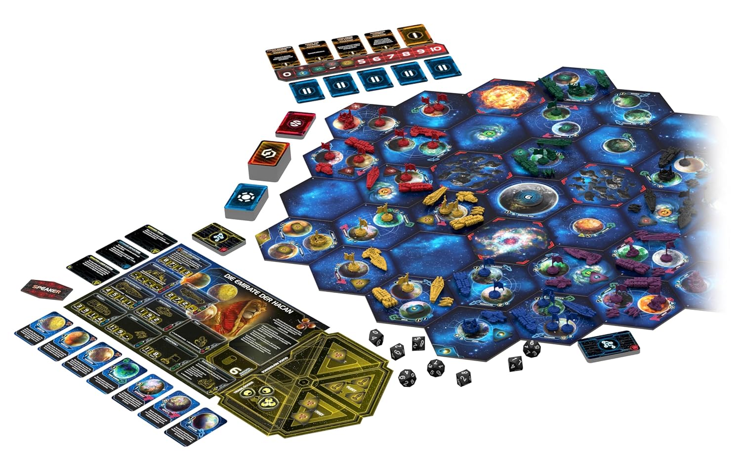 Twilight Imperium (Fourth Edition) ist ein Spiel der galaktischen Eroberung, in dem drei bis sechs Spieler die Rolle einer von siebzehn Fraktionen übernehmen, die durch militärische Macht, politische Manöver und wirtschaftliche Verhandlungen um die galaktische Herrschaft kämpfen. Jede Fraktion bietet ein völlig anderes Spielerlebnis, von den Wurmloch-hoppenden Geistern von Creuss bis zu den Emiraten von Hacan, Meistern des Handels und der Wirtschaft. Diesen siebzehn Rassen werden viele Wege zum Sieg angeboten, aber nur einer kann auf dem Thron von Mecatol Rex als neuer Meister der Galaxie sitzen. Keine zwei Spiele von Twilight Imperium sind identisch. Zu Beginn eines jeden galaktischen Zeitalters ist das Spielbrett einzigartig und strategisch konstruiert, wobei 51 Galaxienfliesen verwendet werden, die alles von üppigen neuen Planeten und Supernovae bis hin zu Asteroidenfeldern und Gravitationsrissen enthalten. Die Spieler erhalten eine Hand dieser Fliesen und erschaffen abwechselnd die Galaxie um Mecatol Rex, den Hauptplaneten, der in der Mitte des Brettes sitzt. Ein Ionensturm könnte eure Rasse daran hindern, durch die Galaxie zu kommen, während ein zufällig platziertes Gravitationsriss euch vor euren Feinden schützen könnte. Die Galaxie gehört dir, um sie zu beherrschen. Eine Runde von Twilight Imperium beginnt damit, dass die Spieler eine von acht Strategie-Karten auswählen, die sowohl die Reihenfolge der Spieler bestimmen als auch ihrem Besitzer eine einzigartige strategische Aktion für diese Runde geben. Diese können alles tun, von der Bereitstellung zusätzlicher Kommando-Token bis hin zur Kontrolle des Handels in der gesamten Galaxie. Nachdem diese Rollen ausgewählt wurden, bewegen die Spieler abwechselnd ihre Flotten von System zu System, erobern neue Planeten für ihr Imperium und führen Krieg und Handel mit anderen Fraktionen. Am Ende einer Runde versammeln sich die Spieler in einem großen Rat, um neue Gesetze und Programme zu verabschieden, die das Spiel auf unvorhersehbare Weise erschüttern. Nachdem jeder Spieler seine Runde beendet hat, bewegen sich die Spieler auf der Siegesstrecke, indem sie überprüfen, ob sie während der Runde irgendwelche Ziele erreicht haben und diese punkten. Die Ziele werden bestimmt, indem zu Beginn jedes Spiels zehn öffentliche Zielkarten aufgestellt und dann nach und nach mit jeder Runde aufgedeckt werden. Jeder Spieler wählt auch zu Beginn des Spiels zwischen zwei zufälligen geheimen Zielen, die Siegpunkte liefern, die nur der Inhaber dieses Ziels erreichen kann. Diese Ziele können alles sein, von der Erforschung neuer Technologien bis hin zur Übernahme des Heimsystems Ihres Nachbarn. Am Ende jeder Runde kann ein Spieler ein öffentliches Ziel und ein geheimes Ziel beanspruchen. Im Laufe des Spiels werden mehr dieser Ziele aufgedeckt und weitere geheime Ziele ausgeteilt, wodurch die Spieler im Laufe des Spiels dynamisch wechselnde Ziele erhalten. Das Spiel wird fortgesetzt, bis ein Spieler zehn Siegpunkte erreicht hat.
